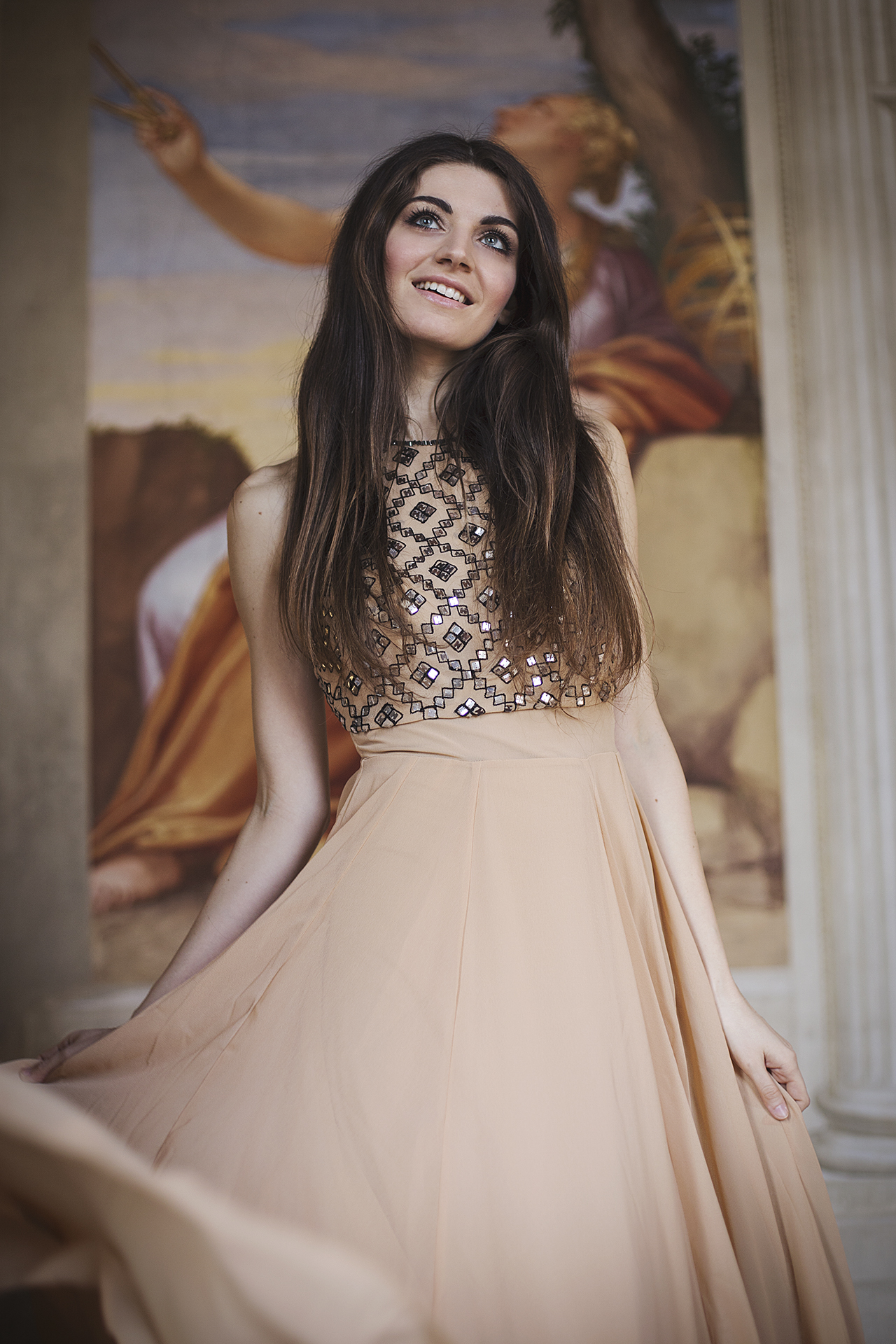 Ho avuto l’opportunità, per un giorno, di potermi addentrare in tutte le sale di questa magica villa veneta nella più completa tranquillità e potermi sentire una principessa indossando questo meraviglioso abito da cerimonia di Asos e respirando a pieni polmoni l’atmosfera che circola tra le stanze affrescate da Giovanni Battista Zelotti. A rendere il tutto ancora più magico, una splendida giornata di sole e un muro profumatissimo di glicine in piena fioritura, collocato sulla scalinata esterna della villa.