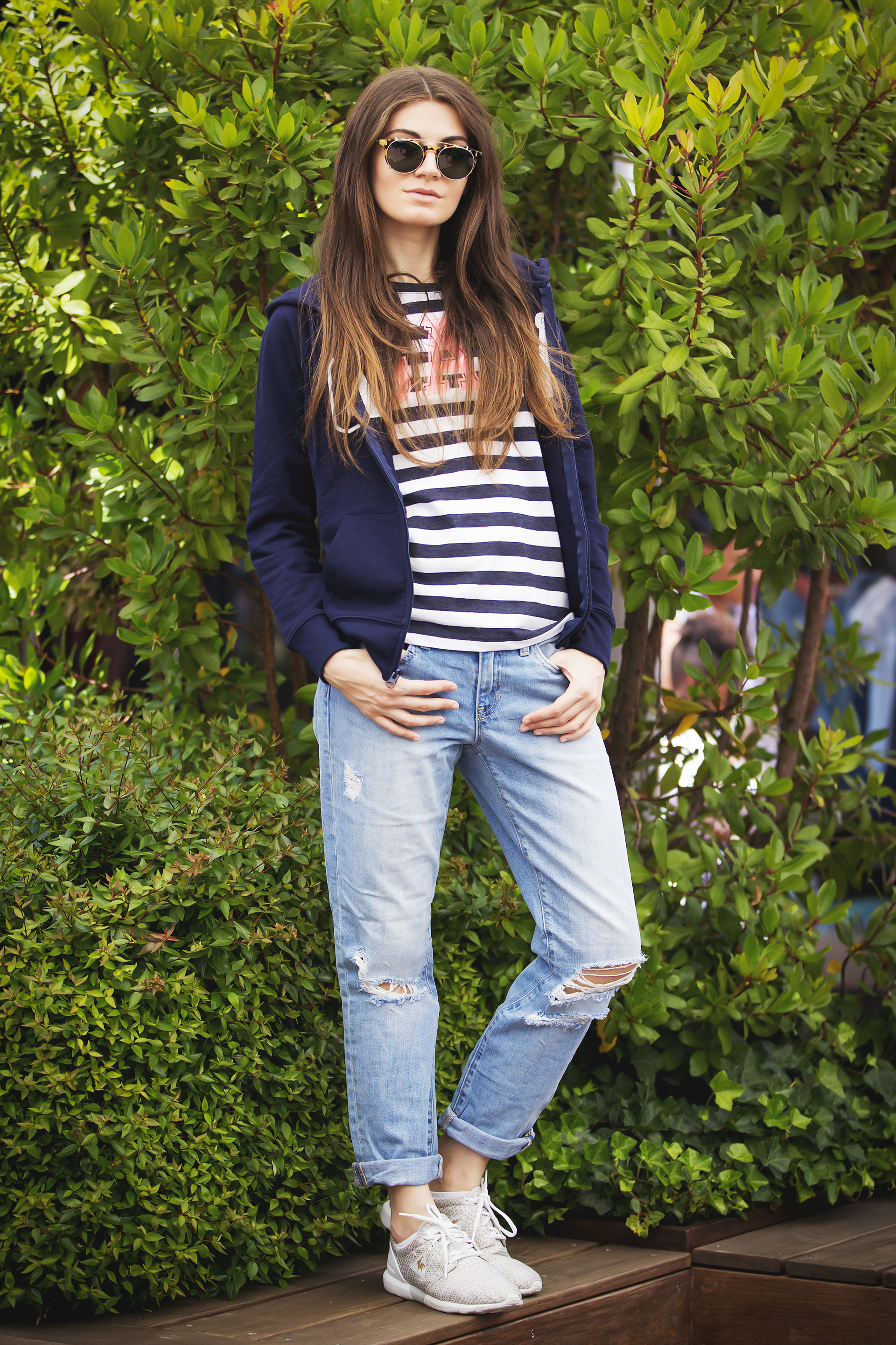 LOOK#2 : per un look sportivo ma sempre trendy mi sono affidata a GAP, un marchio che indosso fin da quando sono piccola e con cui mi sono sempre trovata bene. Sono felice di poter ancora riscontrare un ottimo rapporto qualità prezzo, un marchio che negli anni ha rispettato la sua filosofia proponendo sempre capi alla moda e alla portata di tutti. Negli scatti che seguono indosso un paio di boyfriend dal lavaggio chiaro, abbinati all’iconica t-shirt a righe e felpa con la scritta GAP.