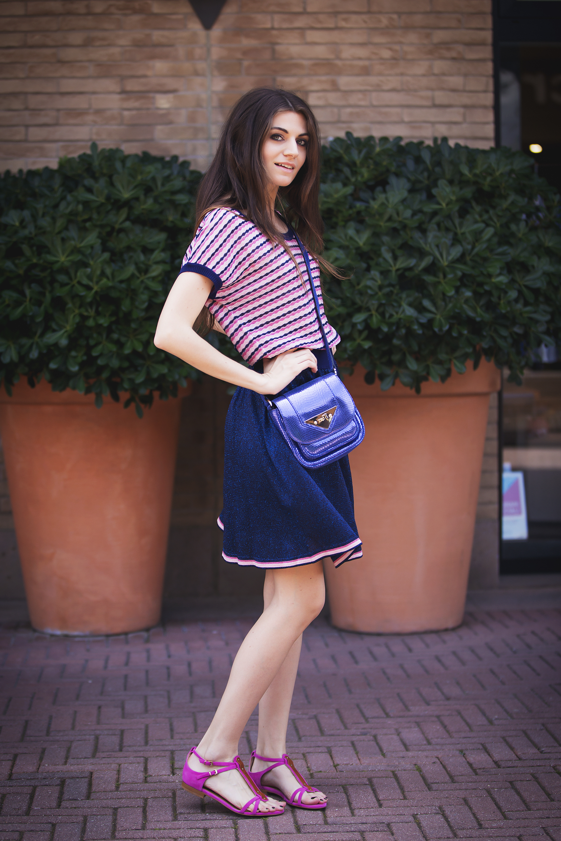 LOOK# 3: per un outfit casual ma più sofisticato e femminile ho scelto un total look di Trussardi Jeans sui toni del blu elettrico e del rosa fucsia. Un abito a fantasia, leggermente glitterato, abbinato a una borsa a tracolla blu e a questi sandali che trovo fantastici. Ideale per un aperitivo estivo o una cena con le amiche!