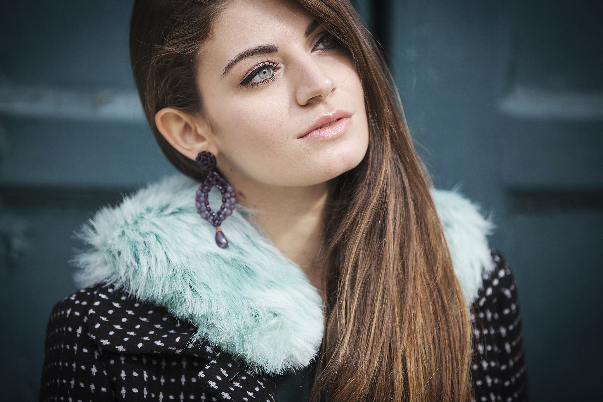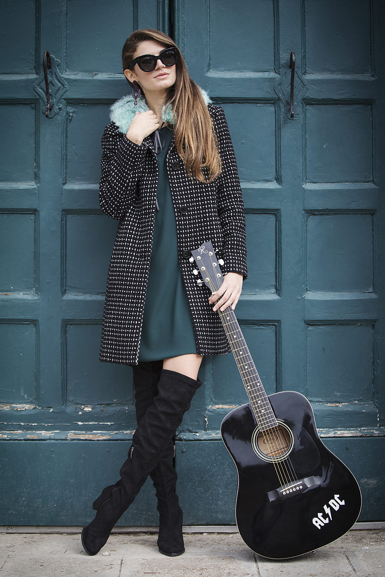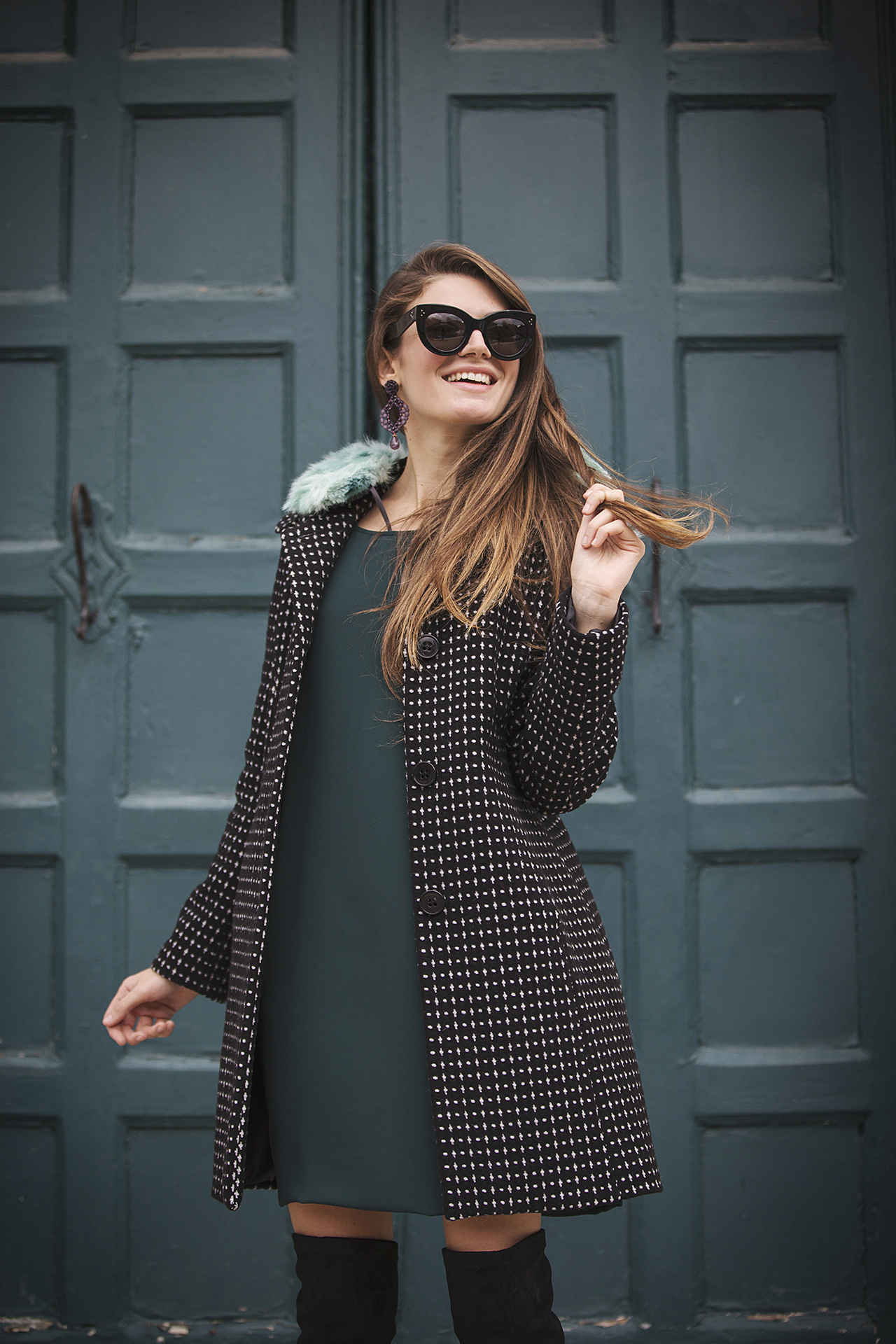 #look1 – Paolo Casalini fur collar, dress and coat, Rapisardi overknee, La via delle Spezie earrings.
